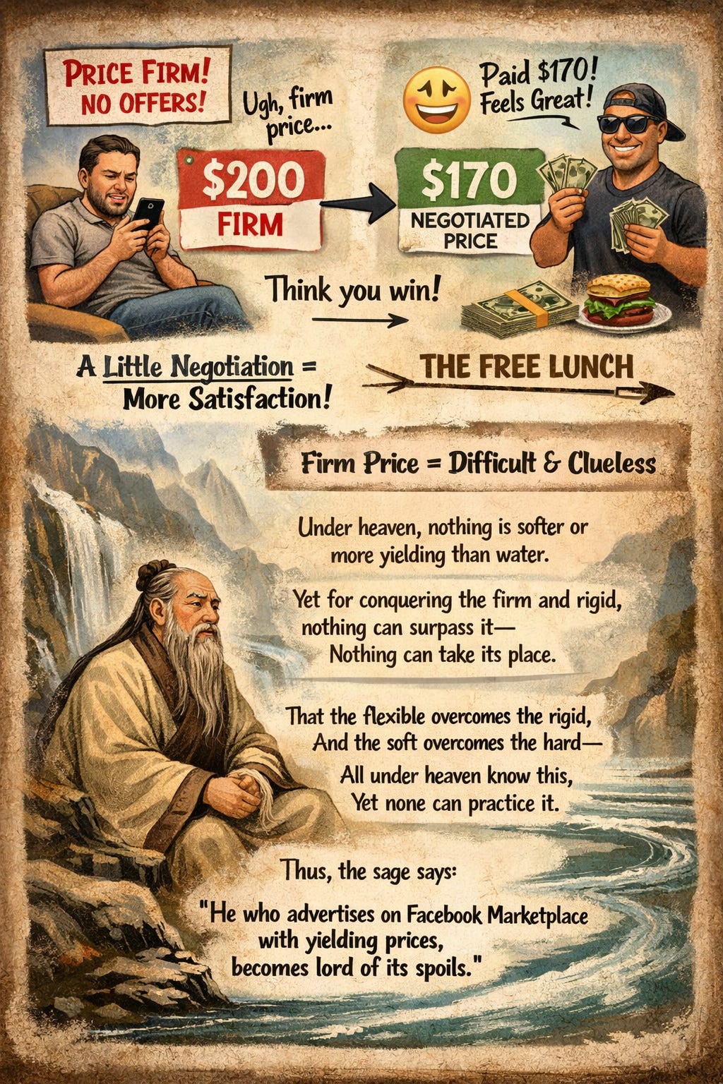 Giving the buyer some room to negotiate down does real economic work. A buyer who pays $170 after talking you down from $200 walks away more satisfied than a buyer who pays $170 at your “firm” price, even though the outcome is identical. The negotiation itself generates perceived value out of.. wait for it... nothing. And, in the off chance someone buys it at your asking price, you just made 20% more than you set out to.